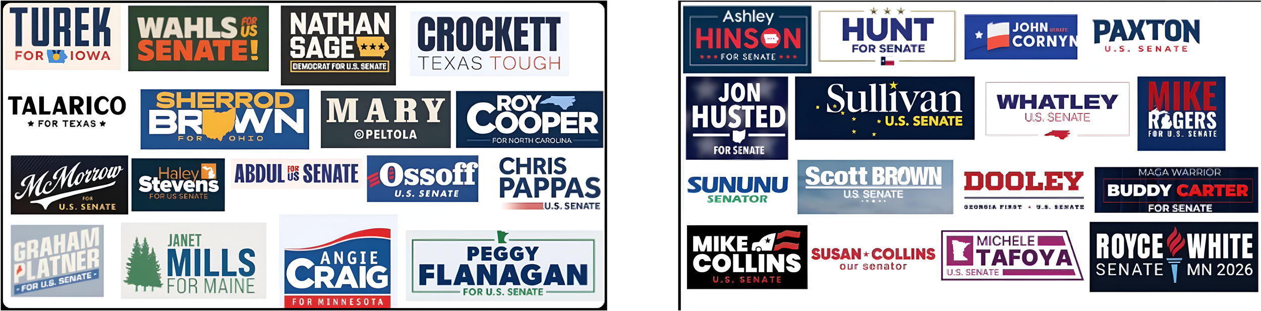 On Twitter/X, the account @polltracker2024 posted two screenshots of campaign logos for some of the most prominent 2026 midterm election candidates. We have posted those screenshots above. Fittingly, the Democrats are on the left, Republicans on the right.